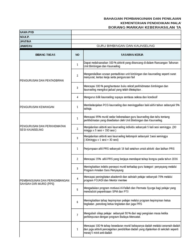 Contoh Borang Keberhasilan Guru Bimbingan Dan Kaunseling Sekolah Rendah - Borang Penilaian Kendiri Guru Bimbingan Dan Kaunseling - Pendidikan profesi guru bimbingan dan konseling/konselor (ppgbk).. Borang markah keberhasilan tahun 2016 gred nama pyd jawata n no.k.p. Guru bimbingan dan konseling merupakan seorang pendidik yang memiliki tugas membantu siswa dalam mengatasi masalah yang sedang dialami siswa dilingkungan sekolah maupun diluar lingkungan sekolah. Dalam hal ini guru pembimbing berkewajiban membina dan mengembangkan kesukarelaan tersebut. Berikut kami kongsikan borang keberhasilan guru bimbingan & kaunseling bagi tujuan penilaian bersepadu pegawai perkhidmatan pendidikan 2016 (pbppp). Pendidikan profesi guru bimbingan dan konseling/konselor (ppgbk).