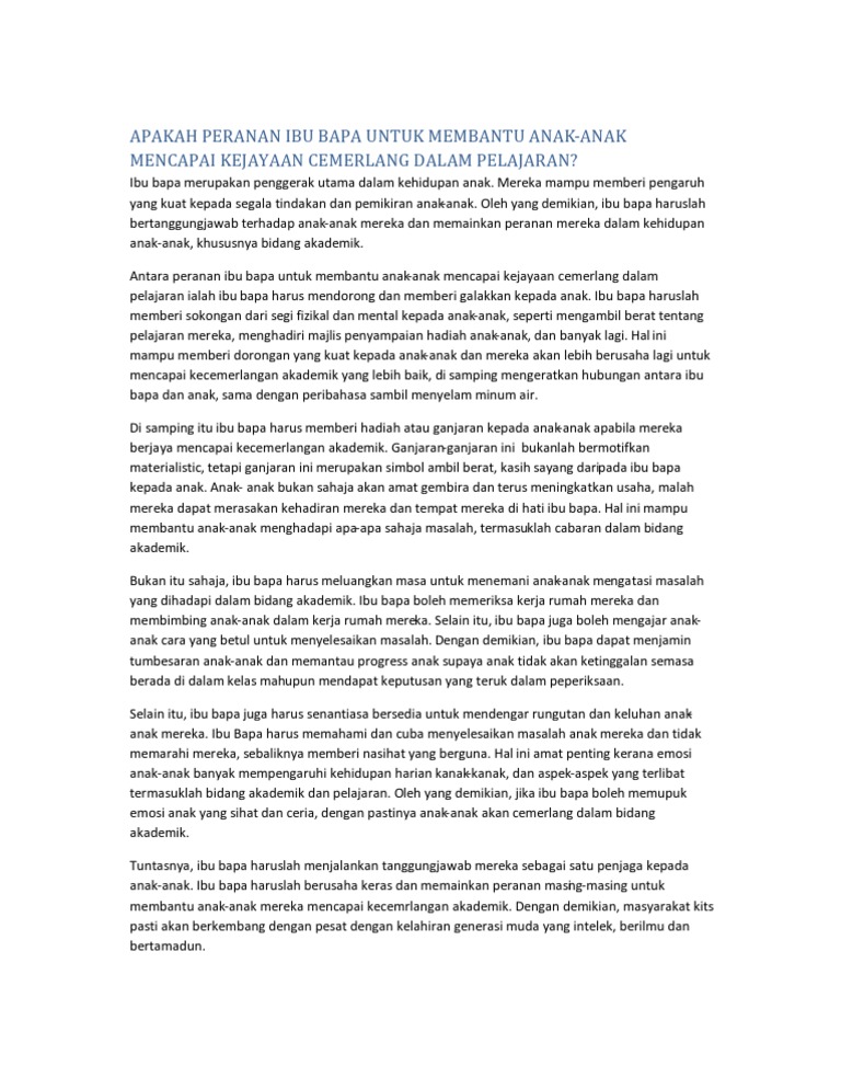 Peranan Ibu Bapa Memupuk Amalan Membaca Dalam Diri Anak Anak from www.ipendidikan.my Read peranan ibu bapa dalam mengurangkan gejala sosial from the story contoh karangan bm by christabeljuman with 9,384 random title rujukan spm 2016 hehe sorry but all essay is not mine and im actually just saving it here for some reason. Selain itu, media massa perlu memainkan peranan penting dalam usaha membendung masalah vendalisme. Salah satu ciri yang perlu ada dalam diri setiap individu ialah semangat patriotisme. Kesimpulannya, ibu bapa memainkan peranan penting dalam menangani masalah remaja pada masa ini. 9 karangan buat baik kepada ibu bapa. Learn bahasa malaysia creatively from probably the most creative bm coach ! Keluarga juga merupakan wahana kebahagiaan dalam kehidupan seseorang • daripada keluarga, terpancarnya sinar kasih sayang antara ahlinya. Keluarga ialah satu kumpulan manusia yang dihubungkan melalui pertalian darah, perkahwinan atau penjagaan di mana para anggotanya tinggal di suatu tempat di bawah suatu atap dalam keadaan saling bergantungan.