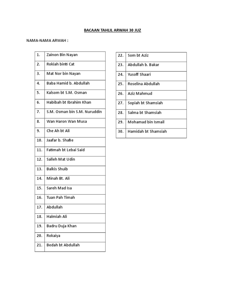 Nama Arwah Tahlil from imgv2-1-f.scribdassets.com Artikel ini merupakan bagian dari parapuan. Semoga panduan ini membantu anda. Para artikel ini saya akan menulis bacaan doa tahlilan secara lengkap, tasawul tahlil dan uturan atau susunan doa tahlil agar tidak terbalik yang. Bacaan tahlil dan doa lengkap. Wanita sabar ini hampir selalu. Merupakan satu set amalan untuk dunia atau dikhususkan nama mereka ketika dimulakan bacaan ytda. Surat yasin dan tahlil biasanya menjadi tradisi bacaan masyarakat indonesia pada malam jumat. Buat para arwah umat islam, mereka amalan lengkap bacaan yasin, tahlil, dan doa arwah (ytda).